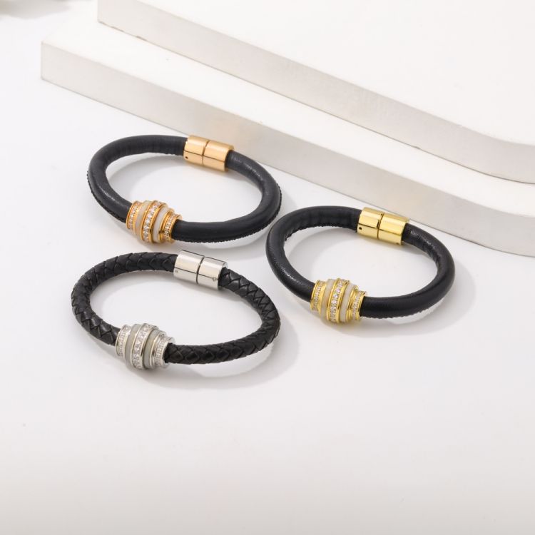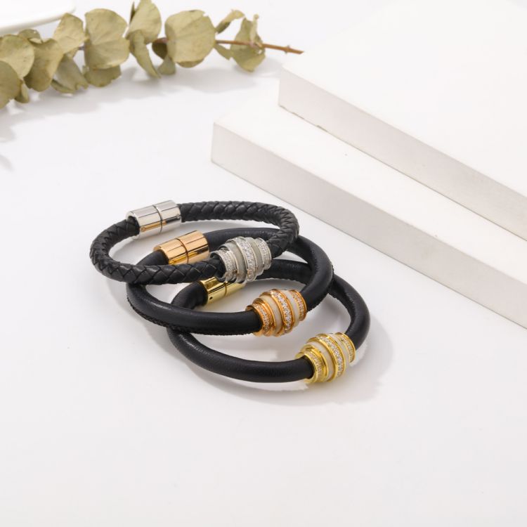 饰品厂家不锈钢镶钻编织皮革磁性男女款手镯
