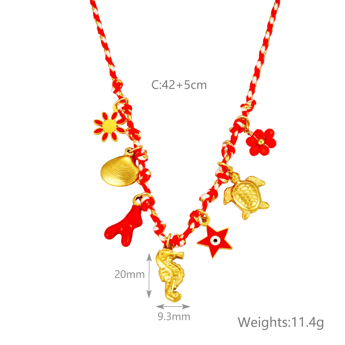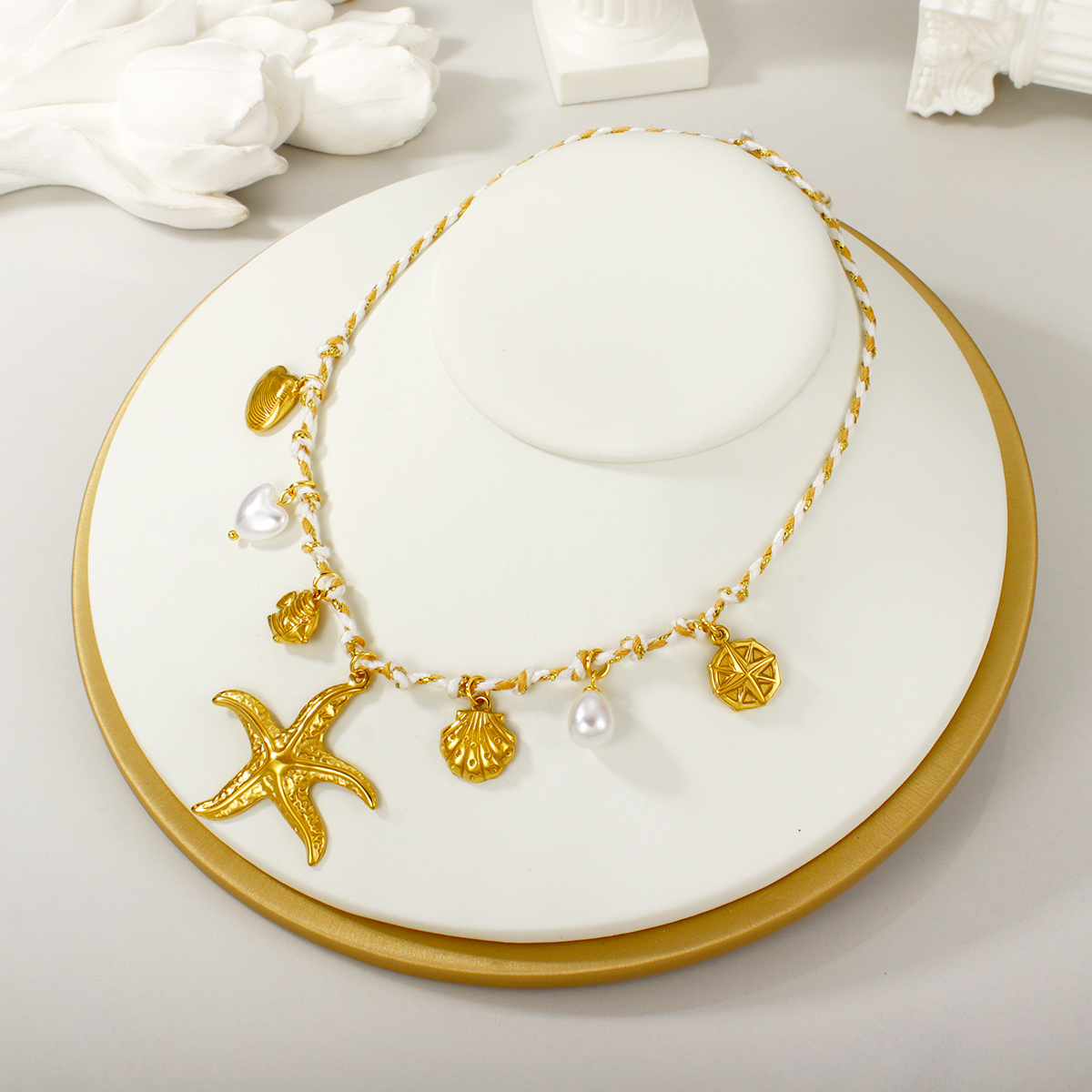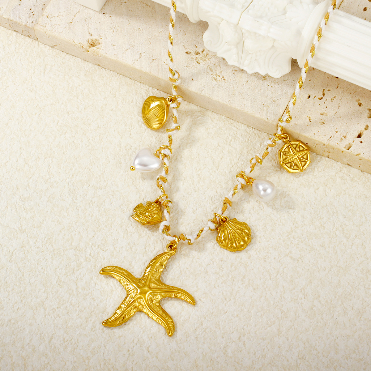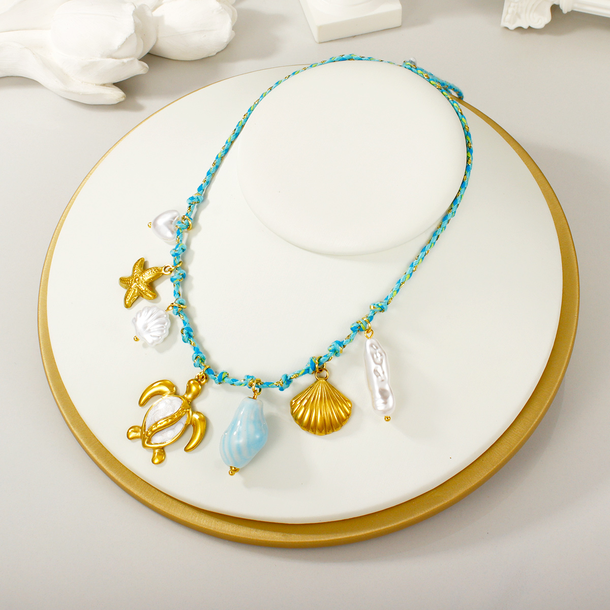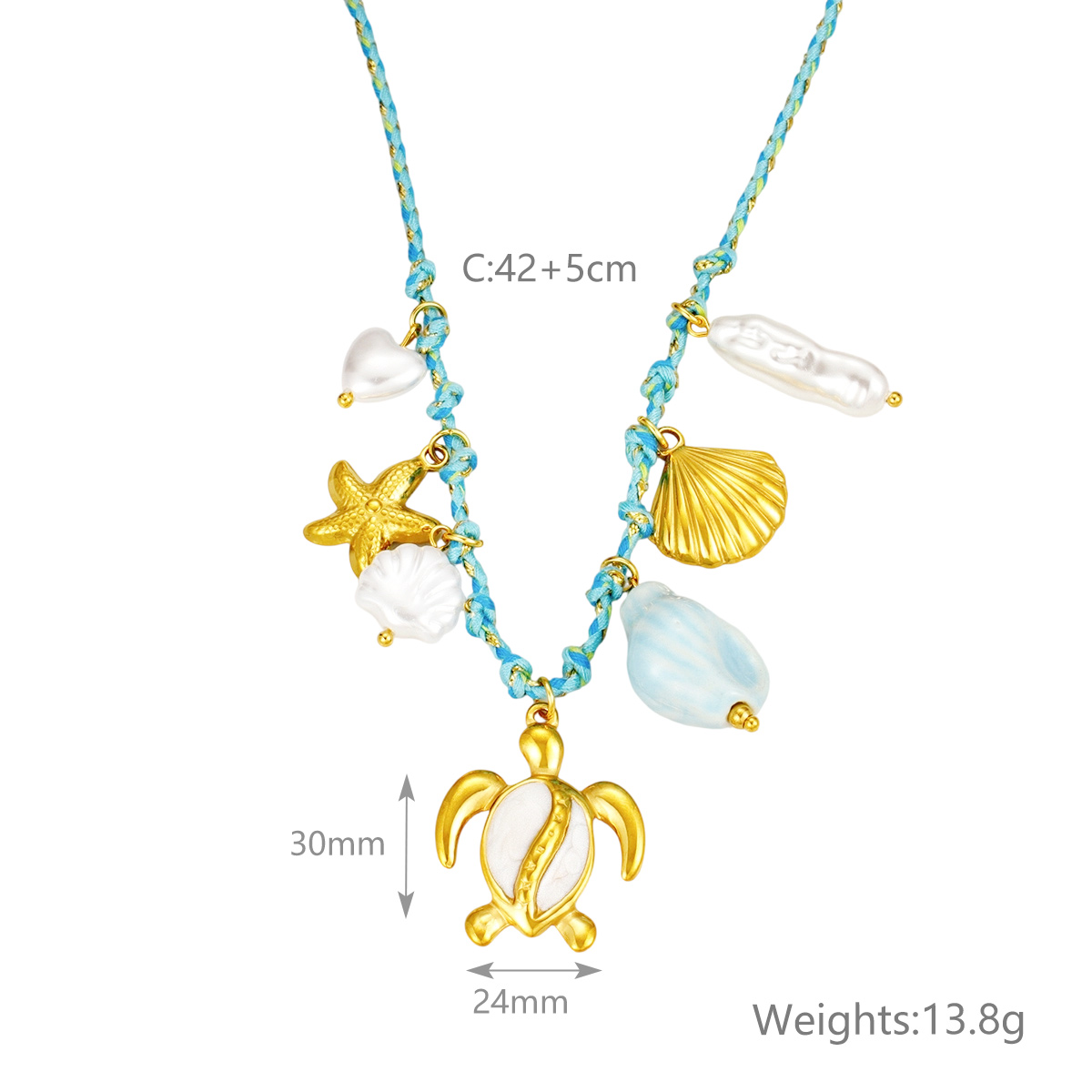 "金海星珍珠心形花朵吊坠多色编织项链"