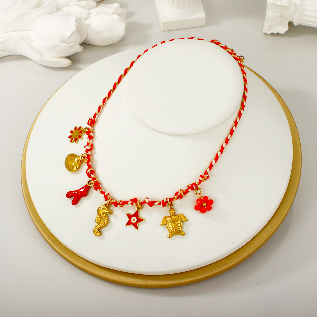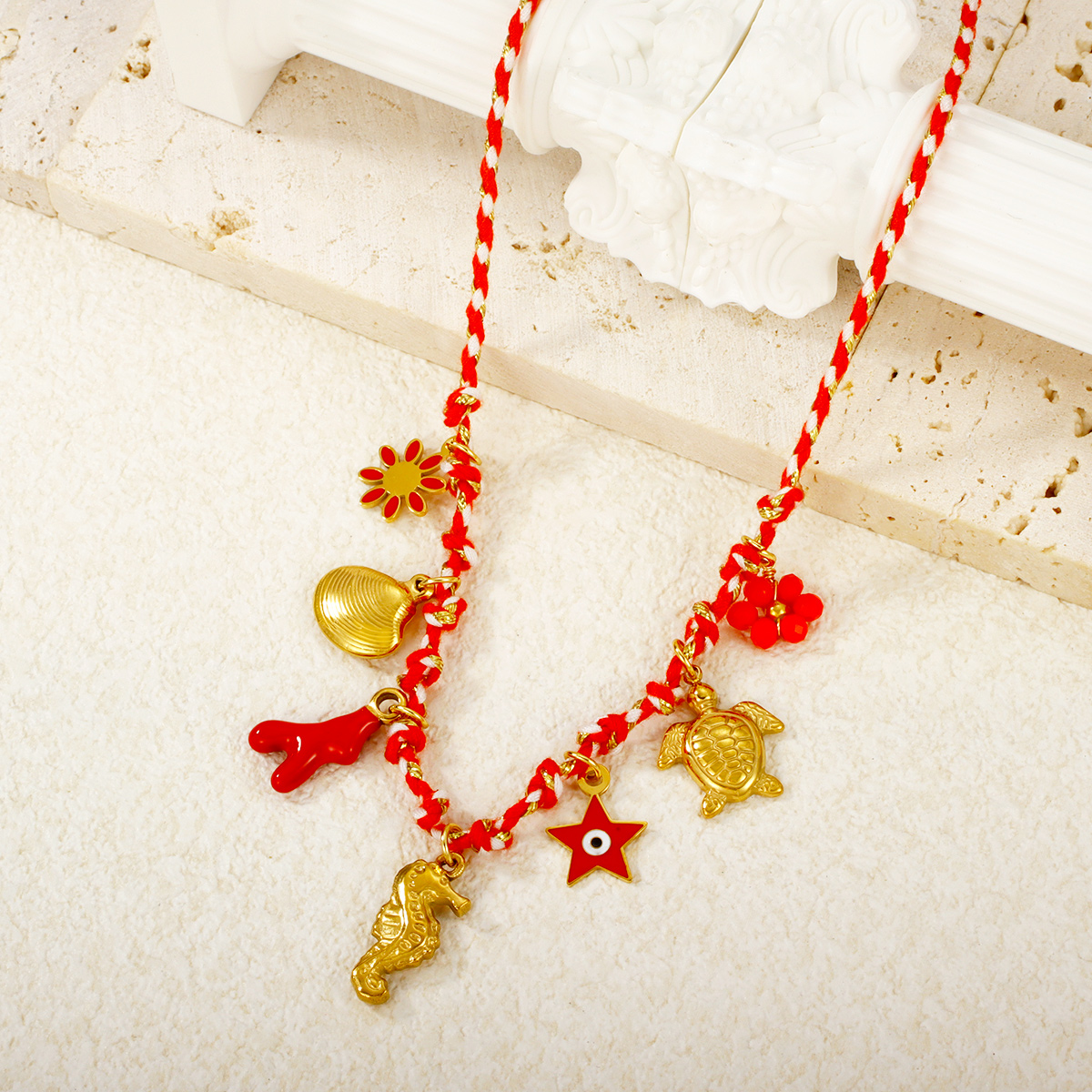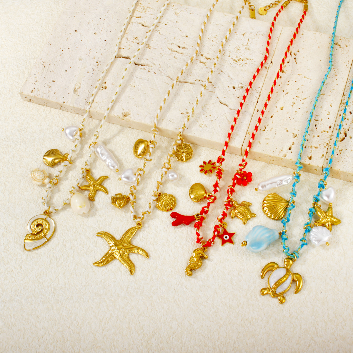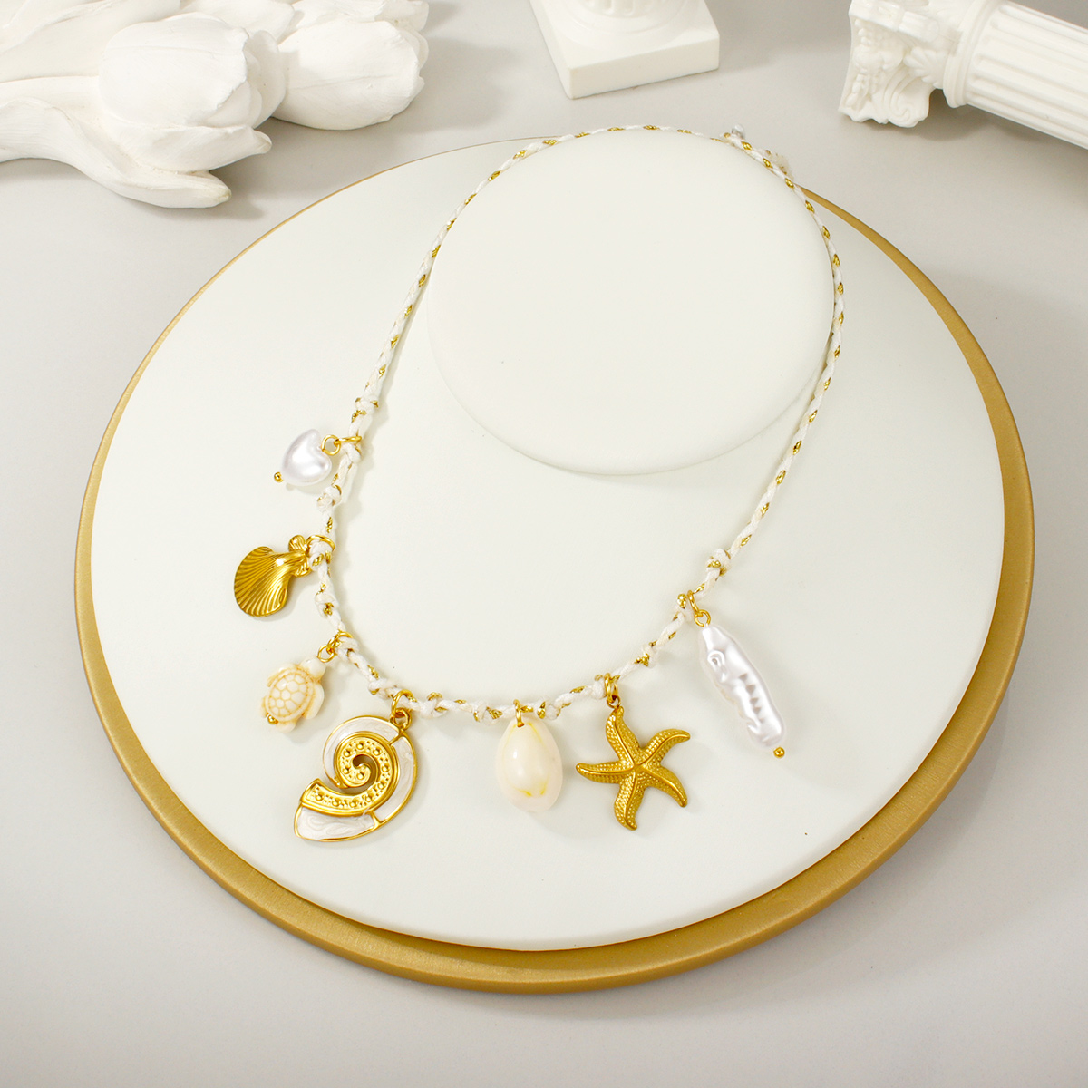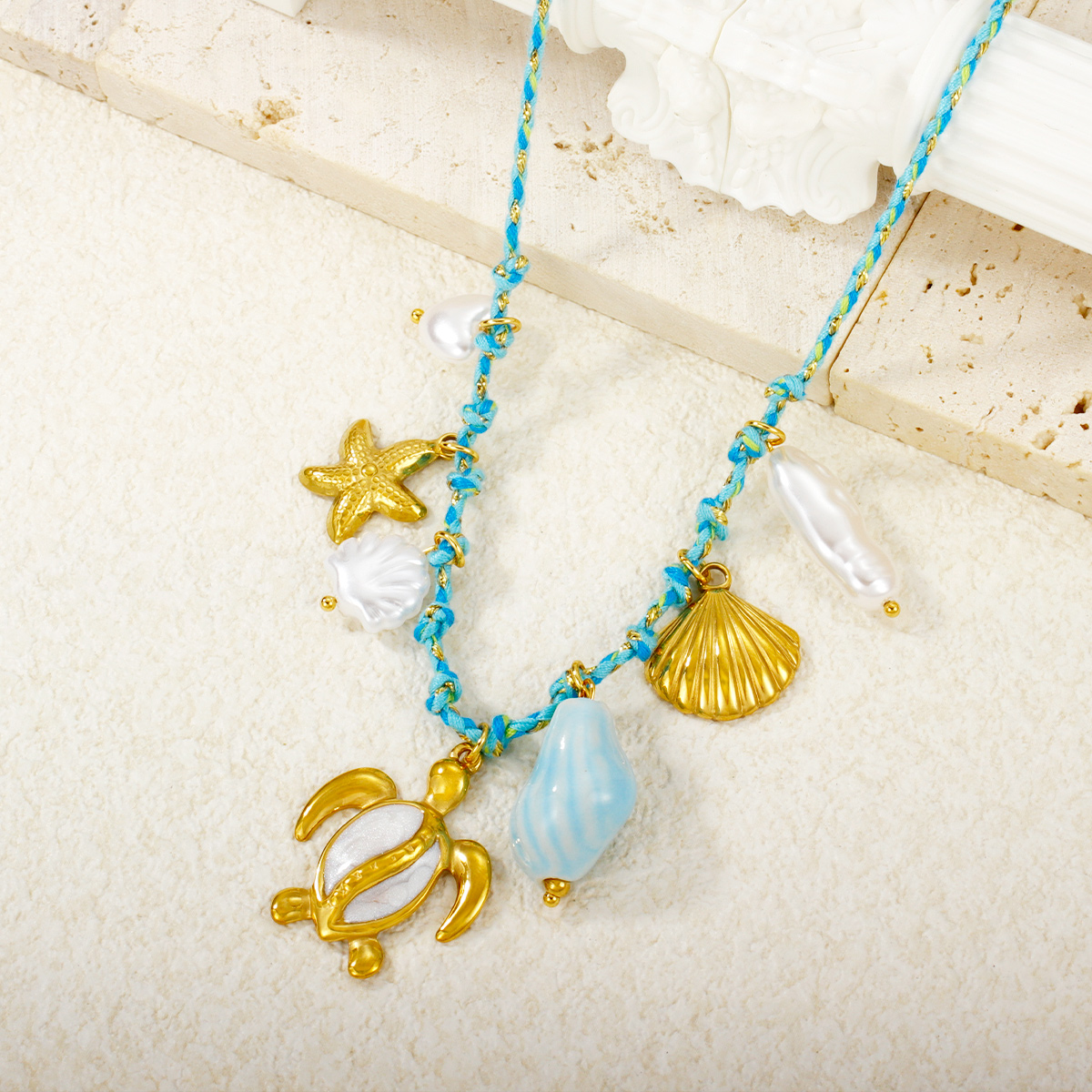 "金海星珍珠心形花朵吊坠多色编织项链"