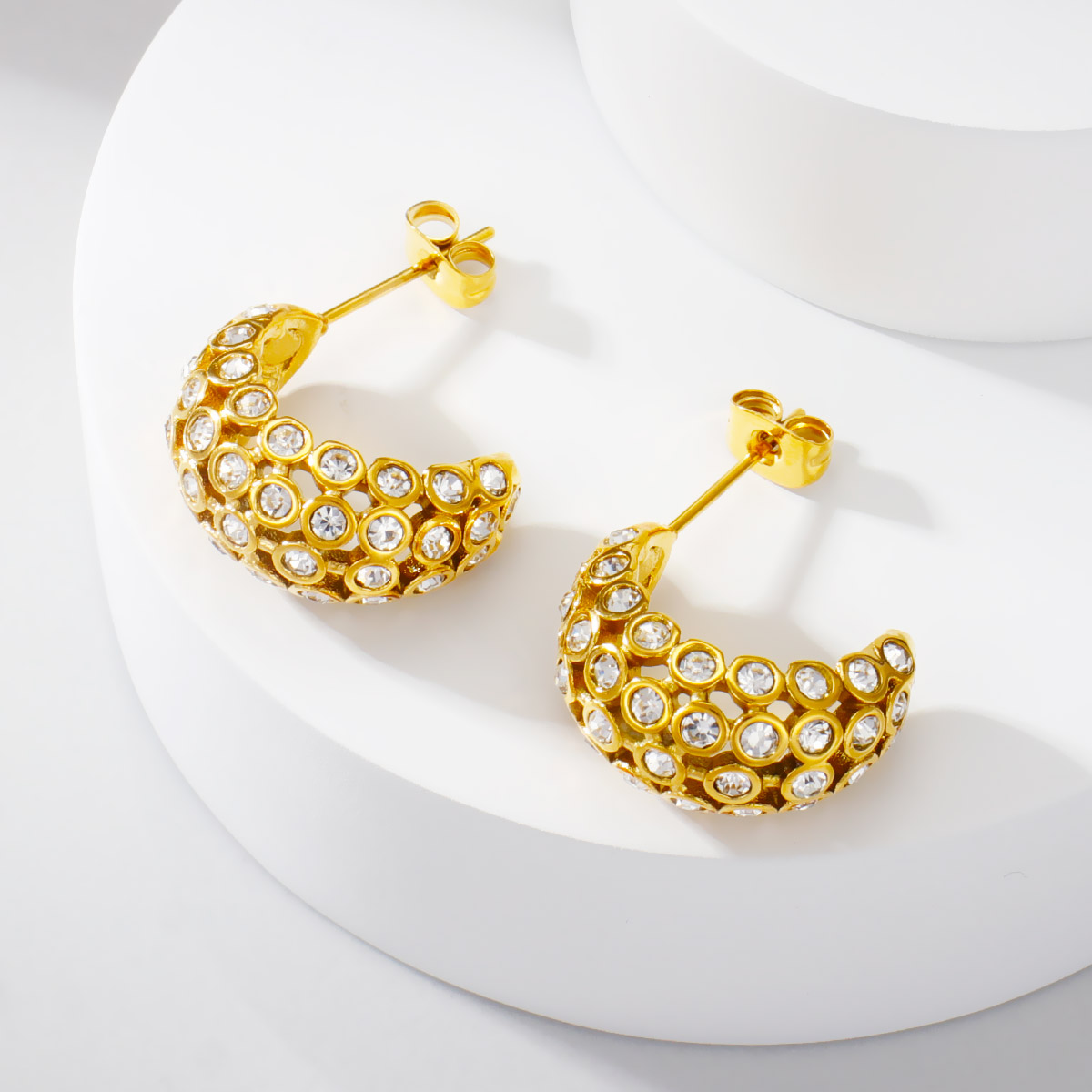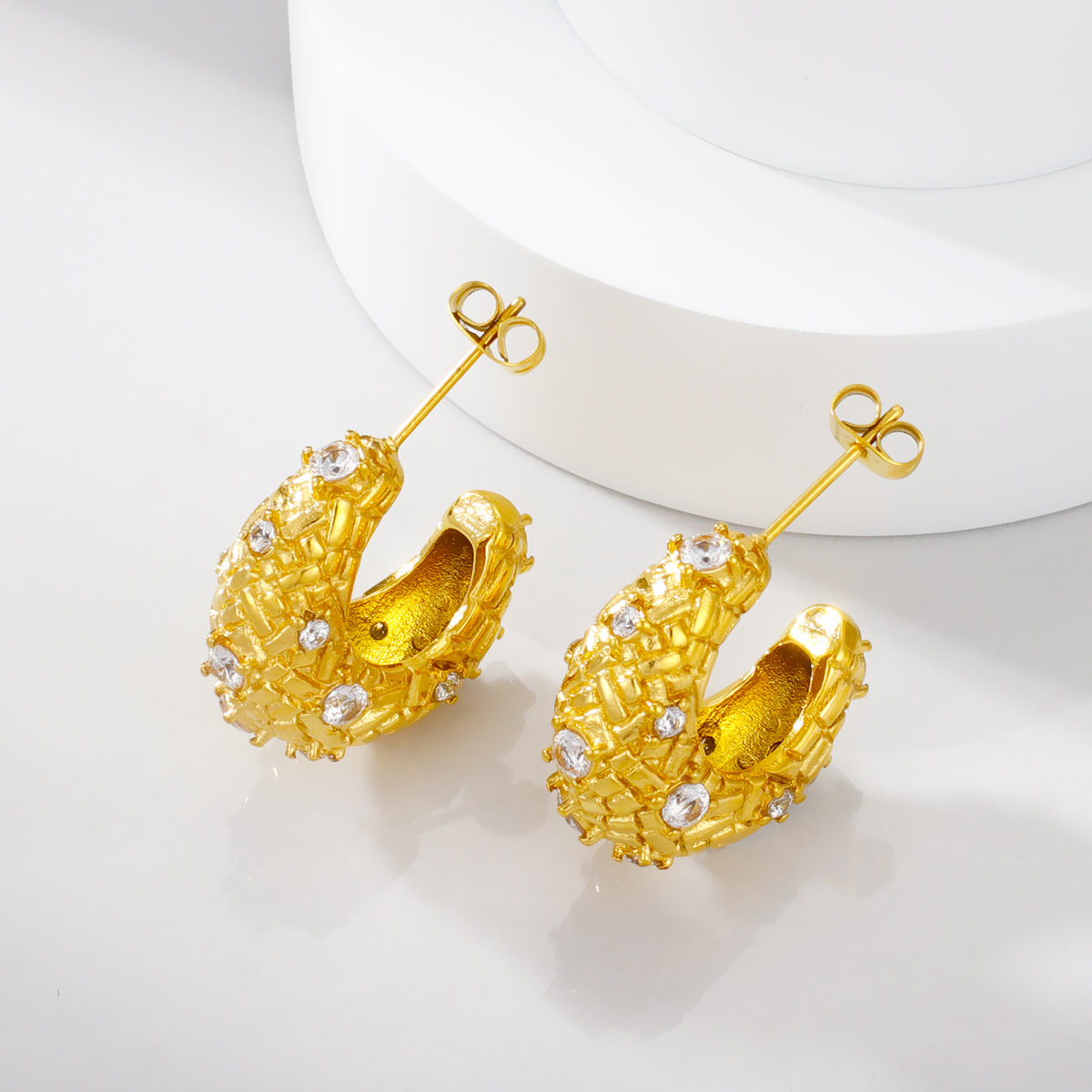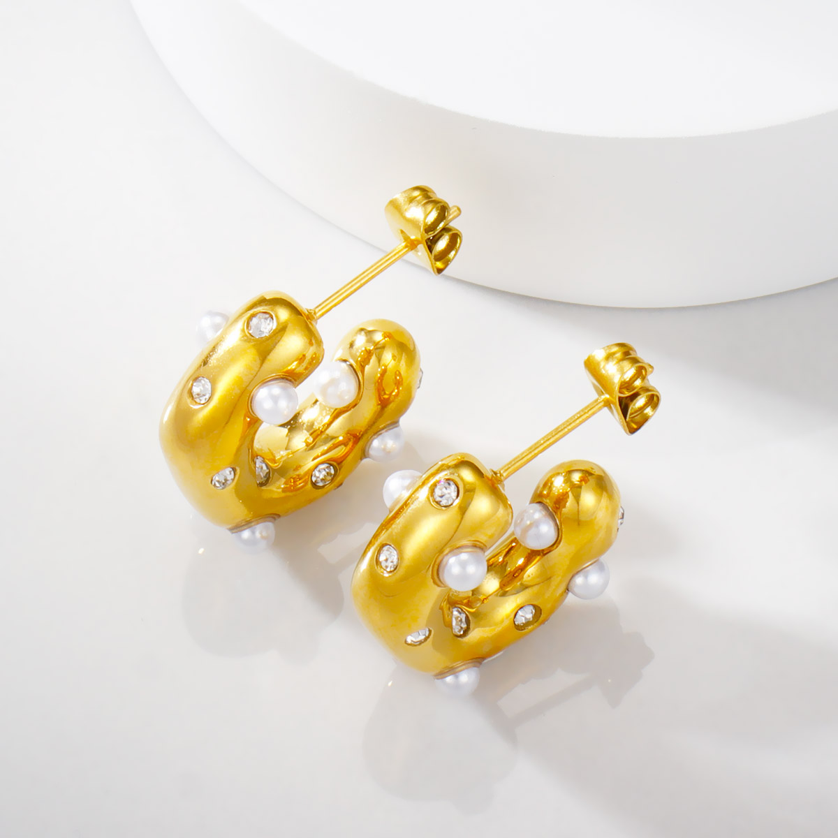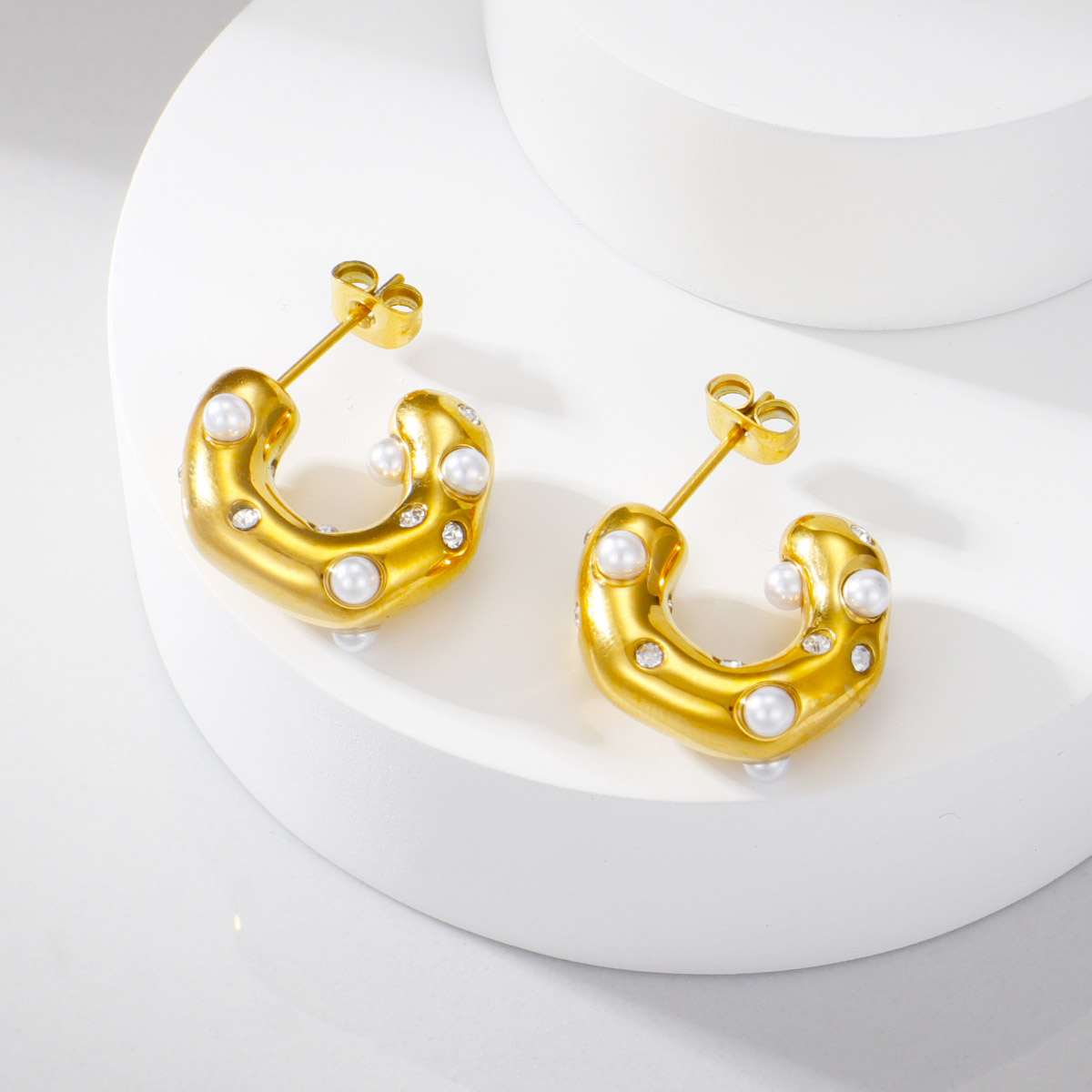 18k镀金不锈钢锤纹珍珠锆石C形耳环