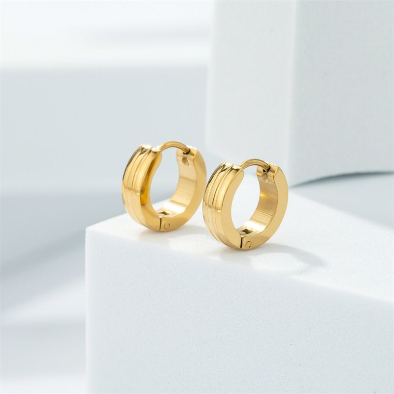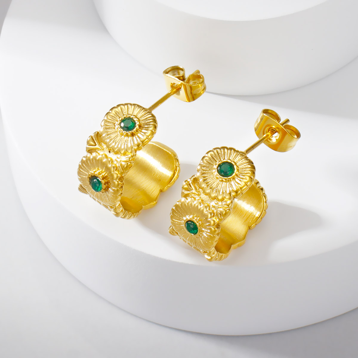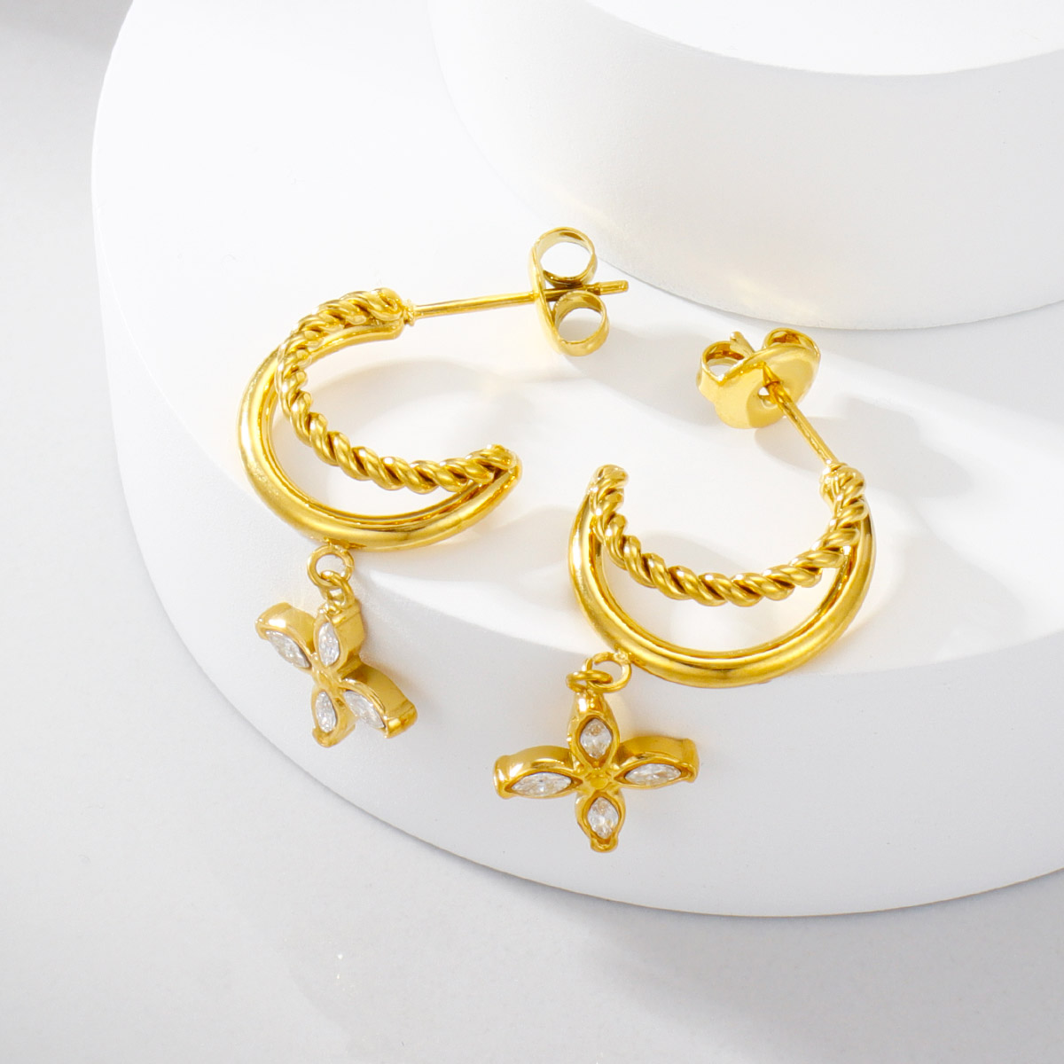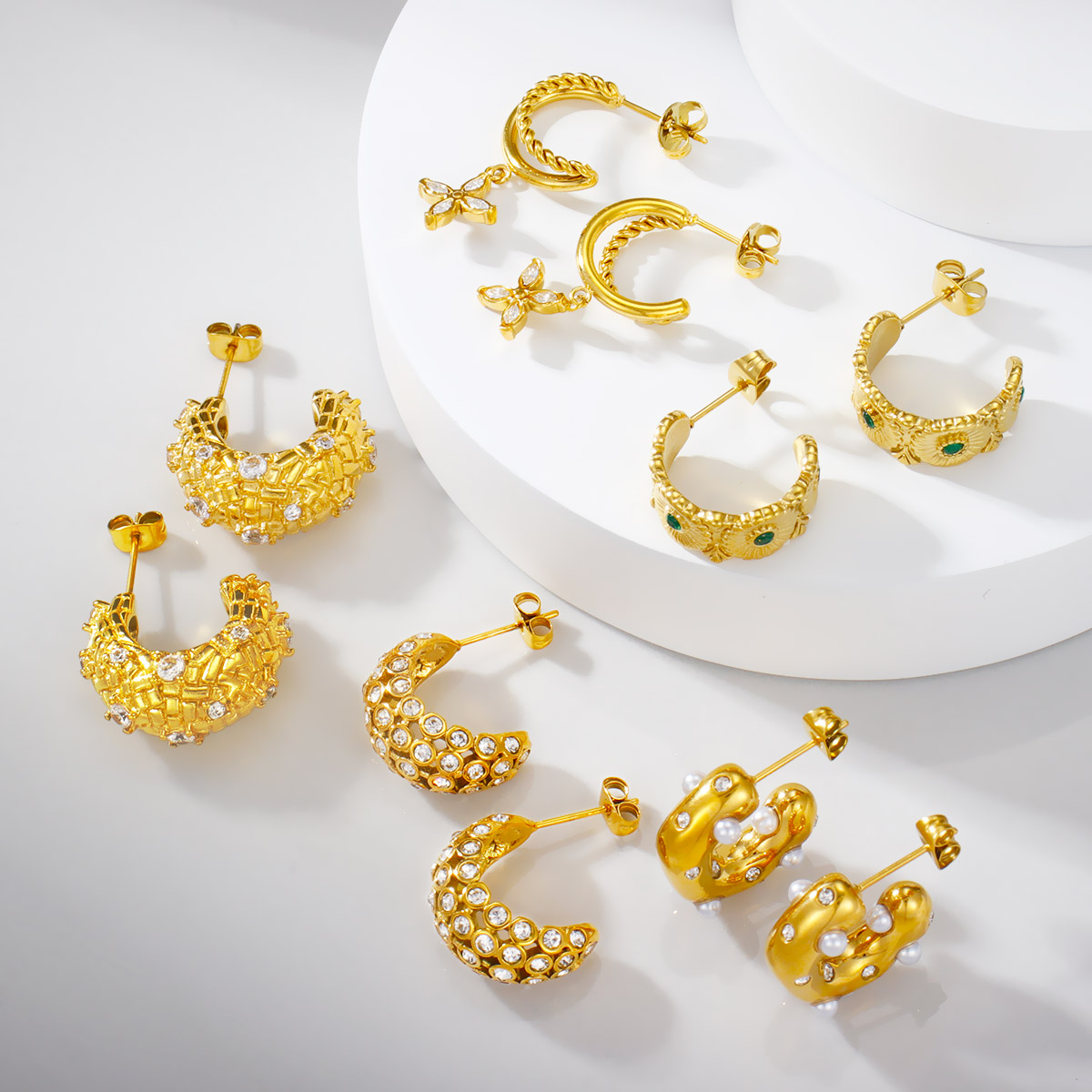 18k镀金不锈钢锤纹珍珠锆石C形耳环